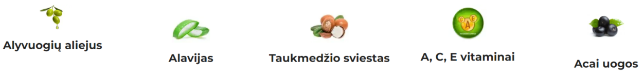 Vitaminas C – stiprus antioksidantas, atliekantis esminį vaidmenį kolageno gamyboje, kuris taip pat apsaugo nuo laisvųjų radikalų daromos žalos. Alyvuogių aliejus – natūralus aliejus, gaminamas iš Viduržemio jūros kraštuose augančių alyvmedžių. Jis atkuria plaukų struktūrą, suteikia glotnumo. Taukmedžio sviestas išgaunamas iš Afrikos tajų medžio riešuto. Tai puikus drėkiklis, padedantis drėkinti, išlyginti ir suteikti blizgesio, kartu atkuriantis plaukų elastingumą. Acai uogų sudėtyje yra visi plaukams reikalingi vitaminai ir mineralai. Alavijas naudojamas dėl savo drėkinančių ir regeneruojančių savybių.